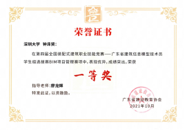 我校的三支参赛队伍经过不懈努力,在广东省建筑信息模型技术员选拔赛的30余支队伍中,取得个人一等奖1项、三等奖5项以及团队第三名和优胜奖2项的优异成绩;最终钟泽贤同学代表深圳大学参加BIM项目管理方向全国总决赛,并以第一名的成绩荣获全国冠军!