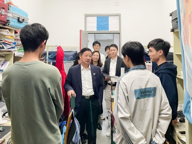 党委书记左英姿、22级本科生班主任蒋卫平、罗享寰、赵德博、辅导员叶栋炜共同走访大一学生的宿舍。