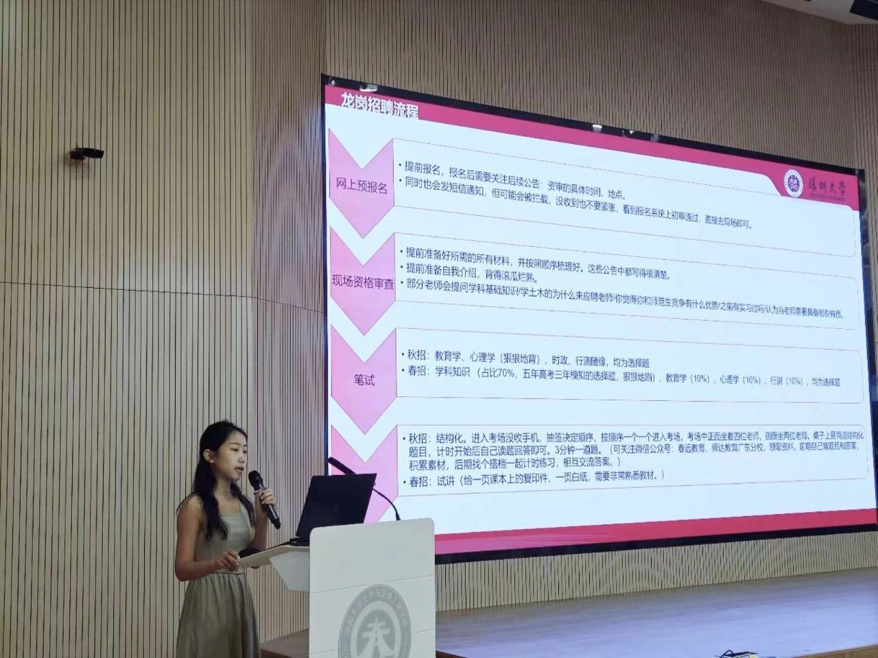姚家艳同学从教师编制基本情况、龙岗编制招聘流程、如何选择报考岗位等三方面展开分享。