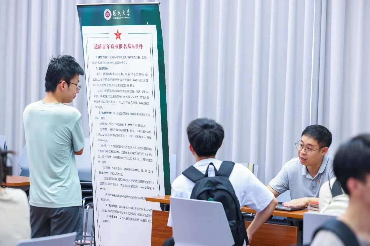 本次双选会特设有征兵展位,不少同学积极前往该展位咨询。征兵展位的负责人潘文龙老师不仅详细介绍了大学生入伍的报名流程、优待政策等。他更是鼓励同学们在毕业时考虑将义务兵、直招军官、直招军士作为自己就业方向,在热血军营中书写青春篇章。