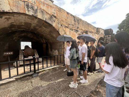 随后,一行人前往威远炮台,这里曾是抵御外侮的坚固壁垒。站在斑驳的城墙边,望着那些历经风雨依然屹立的古炮,耳畔似乎回响着历史的呼唤,心灵深处感受到了前辈守卫家园的坚毅与勇敢。沿着蜿蜒的地道前行,每一步都踏着历史的痕迹,深刻领会到了“落后就要挨打”的历史教训。