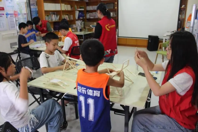 除课堂授课外,通过趣味手工让小朋友们体验“桥梁工程”。在志愿者的帮助下,小朋友们积极地参与到“桥梁”的施工过程中。