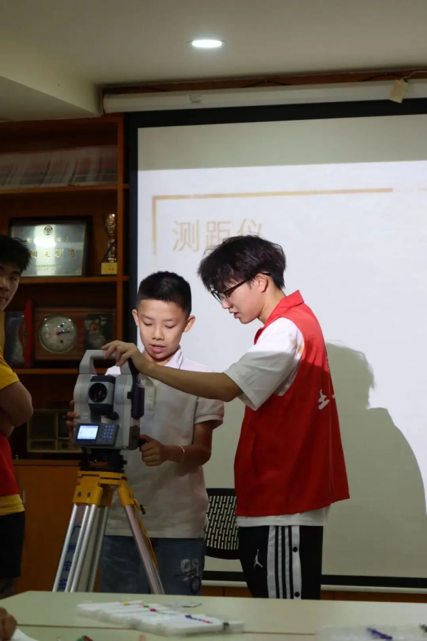 志愿者精心策划了别开生面的课程内容——让小朋友了解并亲手操作全站仪。在志愿者的指导下,他们学会了如何正确使用测距仪,测量距离,记录数据,每一个小小的成功都映射着他们成长的足迹。