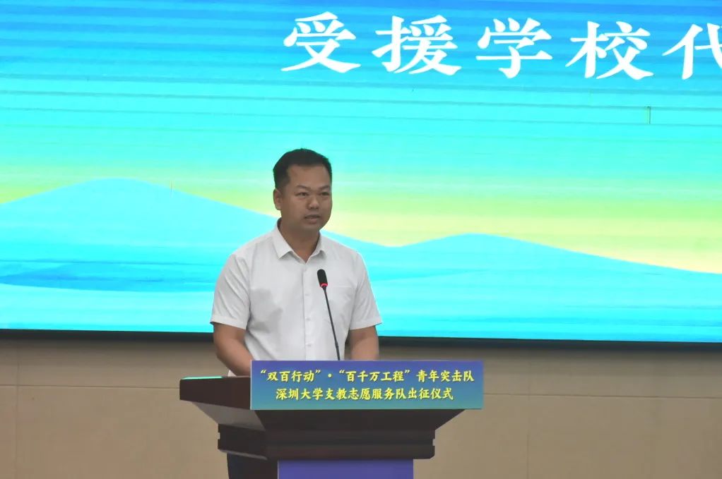 最后,我校团委张春光老师领读出征宣言,“双百行动”“百千万工程”青年突击队深圳大学支教志愿服务队出征仪式到此圆满结束。