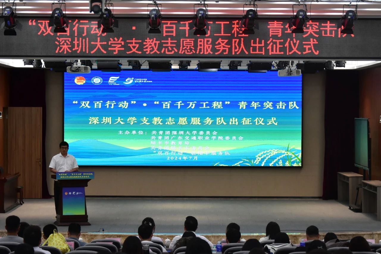 7月16日,共青团深圳大学委员会、共青团广东交通职业学院委员会、“双百行动”驻陆丰服务队、共青团陆丰市委、陆丰市教育局在陆丰教师发展中心举行“双百行动·百千万工程”青年突击队深圳大学支教志愿服务队出征仪式。学院团委书记叶栋炜、团委副书记王青静及14名“砼心相伴支教实践团”成员参会。