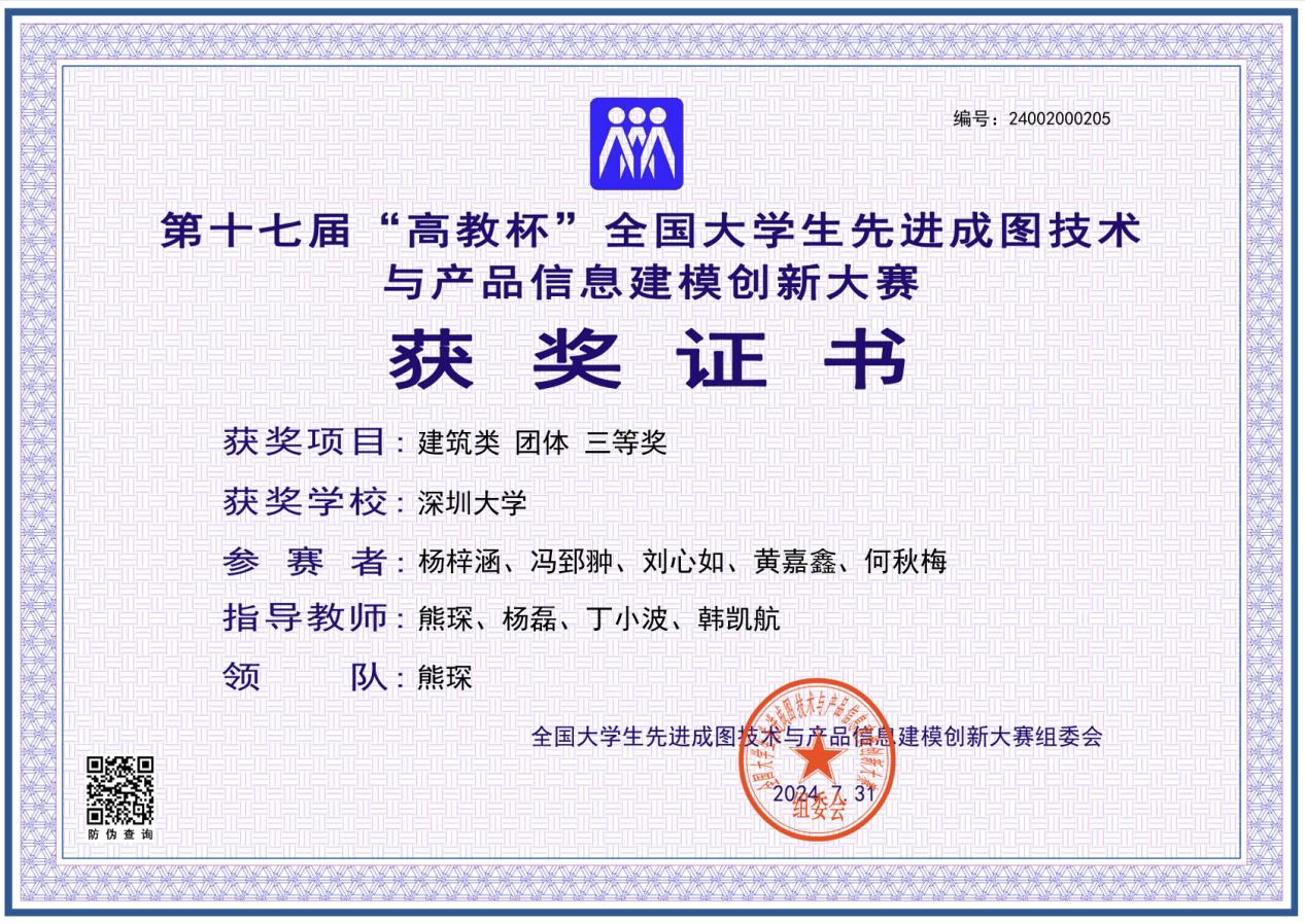 第十七届高教杯”全国大学生先进成图技术与产品信息建模创新大赛全国总决赛于2024年7月27日以线下、线上相结合的形式举办。由我院的11名学生组成的深圳大学(建筑类)团队前往贵州大学参加线下比赛。