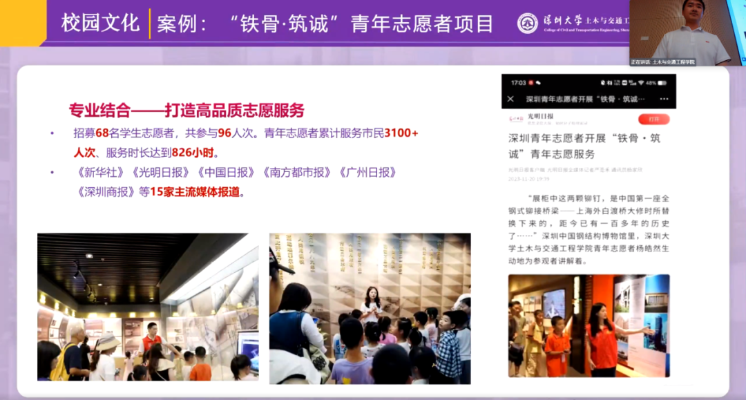 学院团委在助力学生第二课堂的学习和成长中,发挥了重要作用。优秀的团学组织为同学们各类参与各类文体活动、实践活动的机会。叶栋炜老师重点以学院结合专业打造的高品质志愿服务实践项目——“铁骨·筑诚青年志愿者项目”为例,介绍学院注重培养学生学以致用,尽己所能,鼓励同学们走出校园,投身社会实践,为社会发展贡献力量。