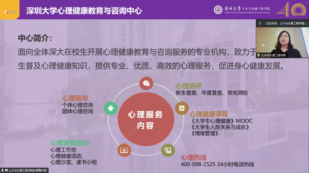 韦主任结合工作实际,通过介绍大学校园里心理困惑的常见案例,包括专业不适应、考试焦虑、恋爱关系、宿舍矛盾等沟通障碍问题等,提供了作为家长该如何应对这些问题的思路和策略。最后,韦主任介绍,为了促进学生的身心健康发展,深圳大学心理健康教育与咨询中心为全体在校生提供了专业、优质、高校的心理服务。与会家长表示,韦主任的分享非常实用,受益良多。