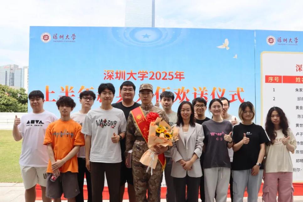 3月13日,深圳大学在校友广场多功能厅举办2025年春季新兵入伍欢送仪式。出席活动的有:深圳大学副校长李永华、我院党委副书记副书记陈碧霞、辅导员潘文龙、班主任张媛媛老师,部分学院领导、辅导员、学生代表以及部分退役老生。仪式由深圳大学党委武装部部长陈云飞主持。