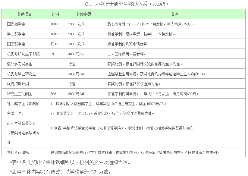 深圳大学继续加大博士研究生的奖助投入。在现有国家奖学金、国家助学金等奖助政策的基础上,扩展了“优博计划”,新设了学业奖学金,增设了腾讯创始人创新奖学金、鹏城奖学金等社会奖学金。目前,深大在校博士研究生每年获得的奖助金额不低于5.3万元。奖助体系详情见附图。