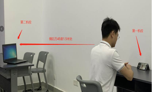 窗体顶端 1、硬件设备: 主机位,使用智能手机,并配置可固定的支架。 第二机位,使用带摄像头的电脑或平板,用于监控复试环境。 设备保持电量充足,建议使用外接电源。 2、网络设备: 考生应确保网络信号良好且能满足复试要求,应具备有线宽带、WIFI、4G/5G网络等两种以上网络条件。主机位建议用WIFI联网(如突发断网可切换至4G/5G网络)。第二机位使用有线网络或者WIFI,禁止使用主机位智能手机的热点。 3、软件要求: 考生提前用下载并安装好复试所需企业微信(主机位)、腾讯会议(第二机位)软件客户端,熟悉软件的具体操作流程。 4、环境要求: 考生自行选择复试场所,要求空间封闭且整洁,环境相对安静、独立、光线明亮(不反光);考生复试时需面向墙面(间隔不超过1米),可视范围内不能有任何与复试内容相关的参考资料,应试场所不能有他人在场。第二机位放置于考生侧后方45度1.5米处。参考环境如下: