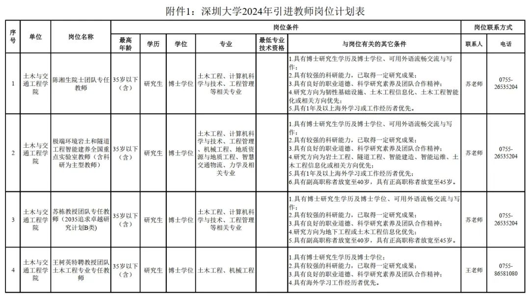 招聘岗位、具体要求及联系方式详见《深圳大学2024年引进教师岗位计划表》。