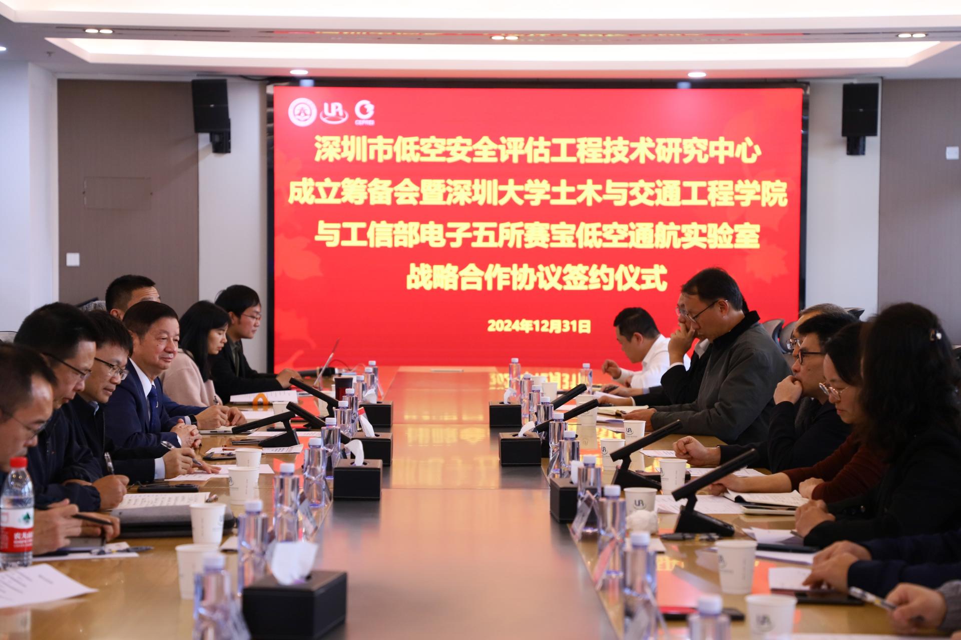 On the afternoon of December 31, 2024, the preparatory meeting for the establishment of the Shenzhen Low altitude Safety Assessment Engineering Technology Research Center and the signing ceremony of the strategic cooperation agreement between the School of Civil and Transportation Engineering of Shenzhen University and the Cyber Low altitude Navigation Laboratory of the Electronic Fifth Institute of the Ministry of Industry and Information Technology were successfully held in Conference Room 905, Zhili Building, Yuehai Campus (South District) of Shenzhen University.