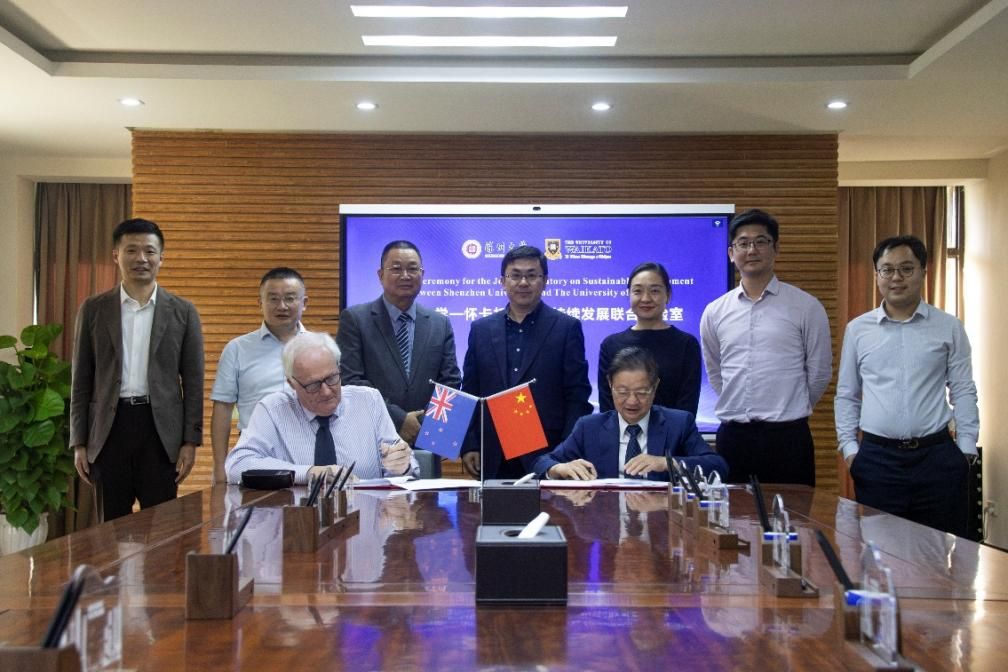 On November 17, 2025, Prof. Chen Xiangsheng, President of the Academy and Academician of the Chinese Academy of Engineering, and Prof. Geoffrey Holmes, Deputy Vice Chancellor of the Department of Science and Technology of the University of Waikato, New Zealand, on behalf of the two universities, signed the “SZU-University of Waikato Joint Laboratory for Sustainable Development Cooperation Agreement”. This cooperation aims to promote scientific research and advanced technology research and development in the fields of ecological environment sustainability such as soil and water degradation mechanism and restoration, ocean and deep geothermal energy utilization, intelligent construction, intelligent transportation, etc., and to build a high-level international scientific research cooperation and international innovative talent training base.