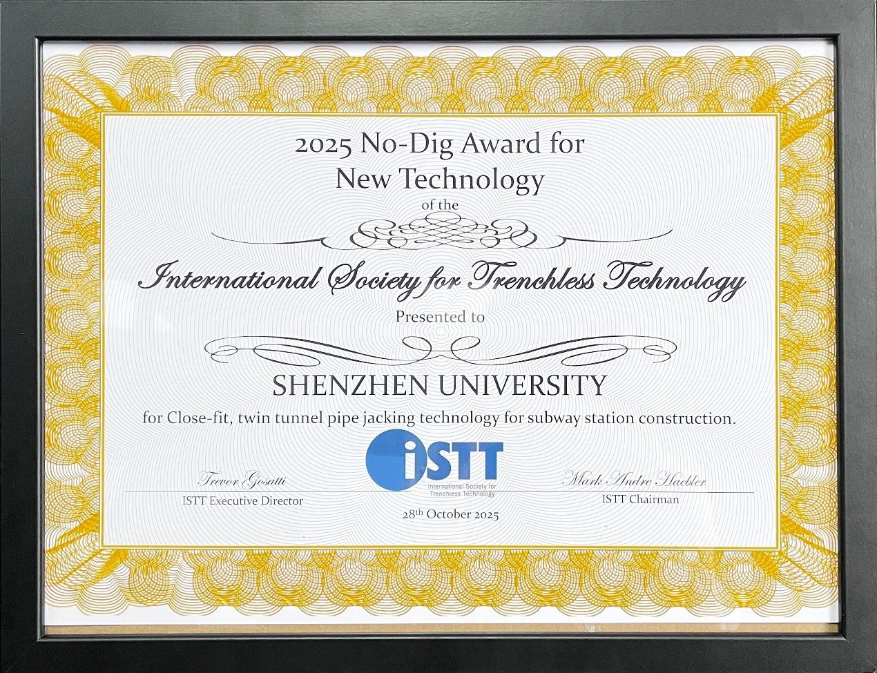 Recently, the International Society for Trenchless Technology (ISTT) announced and awarded the 2025 ISTT No-Dig Award Winners, and the “Close-fit, twin tunnel pipe jacking technology for subway station construction” (Close-fit, twin tunnel pipe jacking technology for subway station construction), led by academician Chen Xiangsheng, president of the Academy, won the Innovative Technology Award. The “Close-fit twin tunnel pipe jacking technology for subway station construction” (Close-fit , twin tunnel pipe jacking technology for subway station construction), led by President Chen Xiangsheng of our academy, was honored with the No-Dig Award. This is another honor after this technology was selected as one of the top ten scientific and technological advances of Shenzhen University in 2023 and China Non-excavation Outstanding Technology Award in 2024.