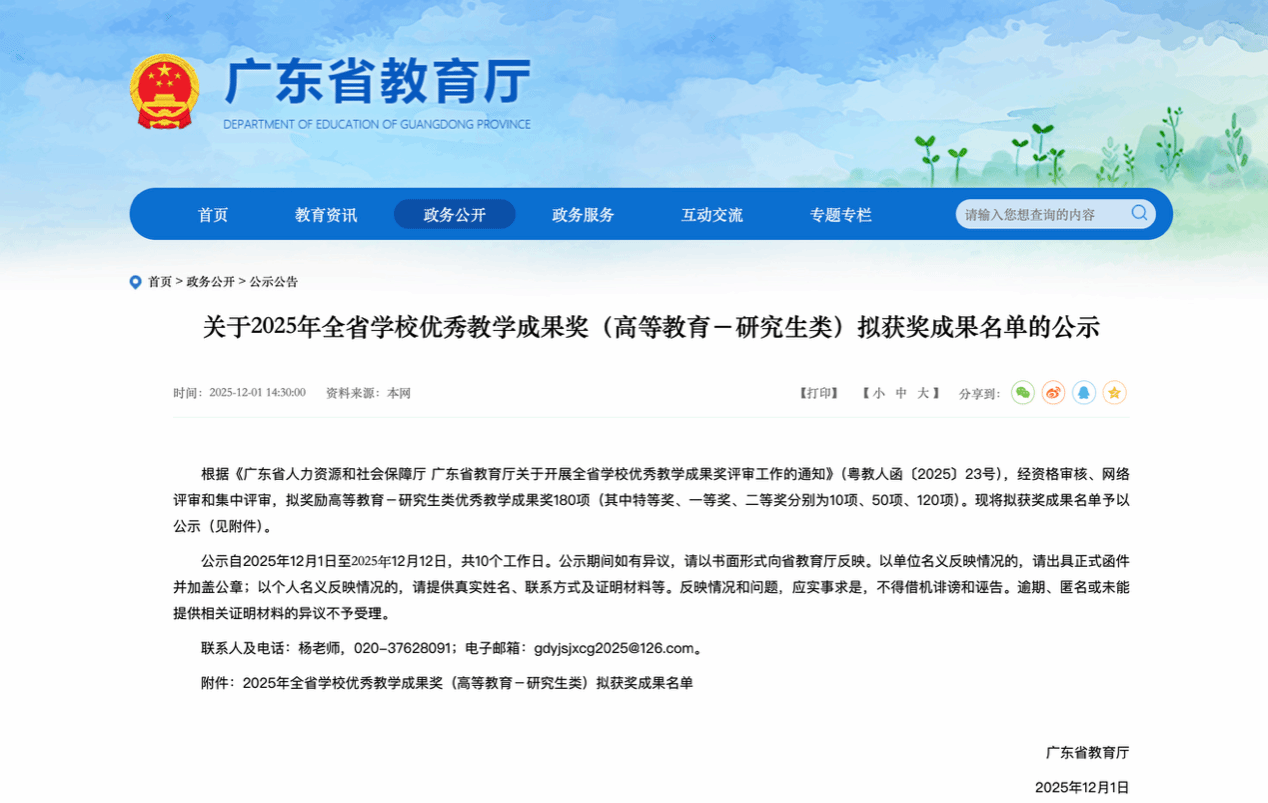 On 12 December 2025, the Department of Education of Guangdong Province formally announced the recipients of the Provincial Outstanding Teaching Achievement Awards (Higher Education – Postgraduate Category). The teaching achievement entitled Innovation and Practice of the Bay Area Outstanding Talent Cultivation Model: "Three-Region Synergy, Four-Chain Integration, Five-in-One Approach" for Building a Strong Nation in Transportation, jointly submitted by Shenzhen University in collaboration with the Guangdong Academy of Building Research, Poly Changda Engineering Co., Ltd., China Communications Road & Bridge Construction Co., Ltd., and Harbin Institute of Technology (Shenzhen), was awarded the Second Prize. This accolade signifies significant progress in our institute's cultivation of innovative postgraduate talent.