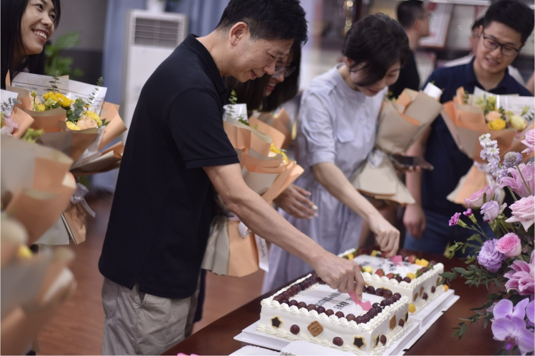 Miss Chen Bixia sent flowers and birthday wishes to the five staff members on their birthday in July. In the joyful birthday celebration, the celebrating teachers surrounded the carefully prepared cake, holding the knife together, each knife is passing the sweet and blessing.