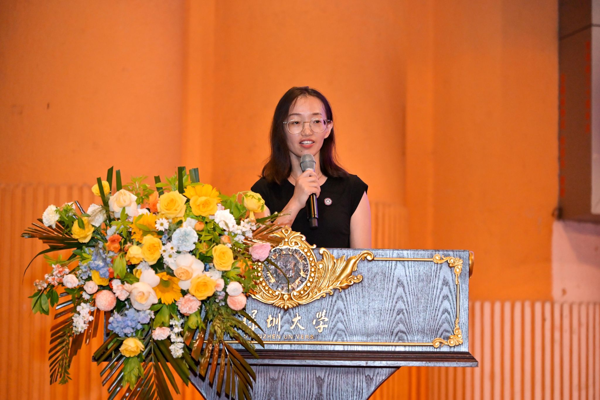 Deng Huidan, as the representative of 2025 Master of Management Science and Engineering freshmen, took the motto of “Ramming earth to build sincerity, sharpening wood to achieve perfection” as the guide, and combined with her own research competition and student work experience in the four years of undergraduate study at SZU, she shared her feelings of growth "Read yourself, transcend yourself, and enjoy yourself! He shared his feelings of “reading oneself, surpassing oneself, delighting oneself”.