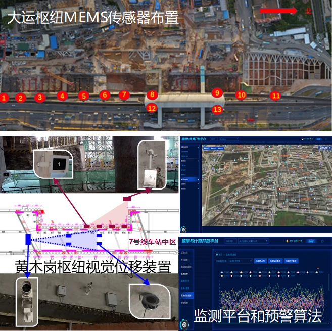 The new foundation pits of Dayun and Huangmugang hubs, which are expanded from Dayun Station of Shenzhen Metro Line 3 and Huangmugang Station of Shenzhen Metro Line 7 respectively, have a large area and depth, and are closely spaced to the existing operating stations, making deformation control extremely difficult. Based on the characteristics of the hub stratum and surrounding structures, Chen's team established a 3D refined model, analysed the force deformation characteristics of the existing above-ground and underground station structures and pile foundations during the construction of the immediately adjacent deep foundation pit, and proposed targeted deformation control measures. MEMS sensors, automated total station, visual displacement and other technologies were used to intelligently sense the deformation of the foundation pit and existing stations; a deformation prediction and early warning platform was developed, and five artificial intelligence algorithms were embedded in the platform to predict and warn structural deformation, ensuring the safety of the foundation pit and existing station structures during the whole excavation process.