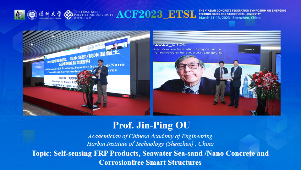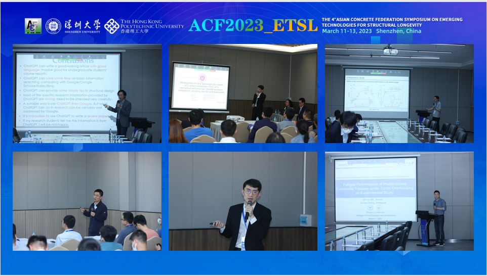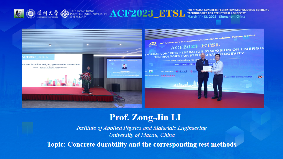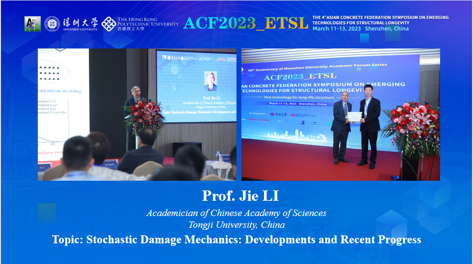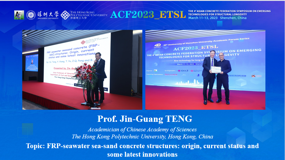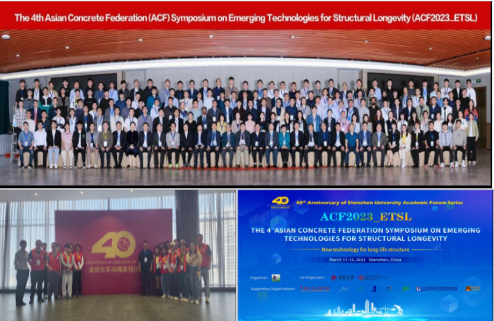 On March 11-13, 2023, the 4th Asian Concrete Institute International Symposium on New Technologies for Structural Longevity (ACF2023_ETSL), organized by the Asian Concrete Institute (ACI) and co-organized by the College of Civil and Transportation Engineering(CCTE) of Shenzhen University and the Department of Civil and Environmental Engineering (CEE) of Hong Kong Polytechnic University, was successfully held in Shenzhen. ETSL)" was successfully held in Shenzhen. As part of the 40th anniversary celebration, this conference was also highly valued by Shenzhen University. The conference invited top experts from home and abroad such as Academician Nie Jianguo from Chinese Academy of Engineering, Academician Ou Jinping from Chinese Academy of Engineering, Academician Miao Changwen from Chinese Academy of Engineering, Academician Lv Xilin from Chinese Academy of Engineering, Academician Teng Jinguang from Chinese Academy of Sciences, Academician Li Jie from Chinese Academy of Sciences, Academician Xu Shilong from Chinese Academy of Sciences and Professor Shi Caijun, President of Asian Concrete Association to attend the conference and make the conference report.