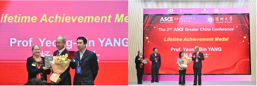 ASCE Greater China awards were also presented, including the Lifetime Achievement Medal to Academician Yongbin Yang, the Distinguished Leadership Medal to Professors Gang Wang and Yang Shen, the Outstanding Young Engineer Award to Professors Duruo Huang, Xiaohua Bao and Jiang Hao, and the Outstanding Instructor Award to Professors Dawei Wang and Yao Cui. Outstanding Young Engineer Award, Outstanding Student Chapter Faculty Advisor Award to Professors Wang Dawei and Cui Yao, and Outstanding Student Award to Professors Lin Qiaoyi, Lei Jiaxin, Lu Lin, Chen Peiyao and Wan Pengjie. Outstanding Student Award.)