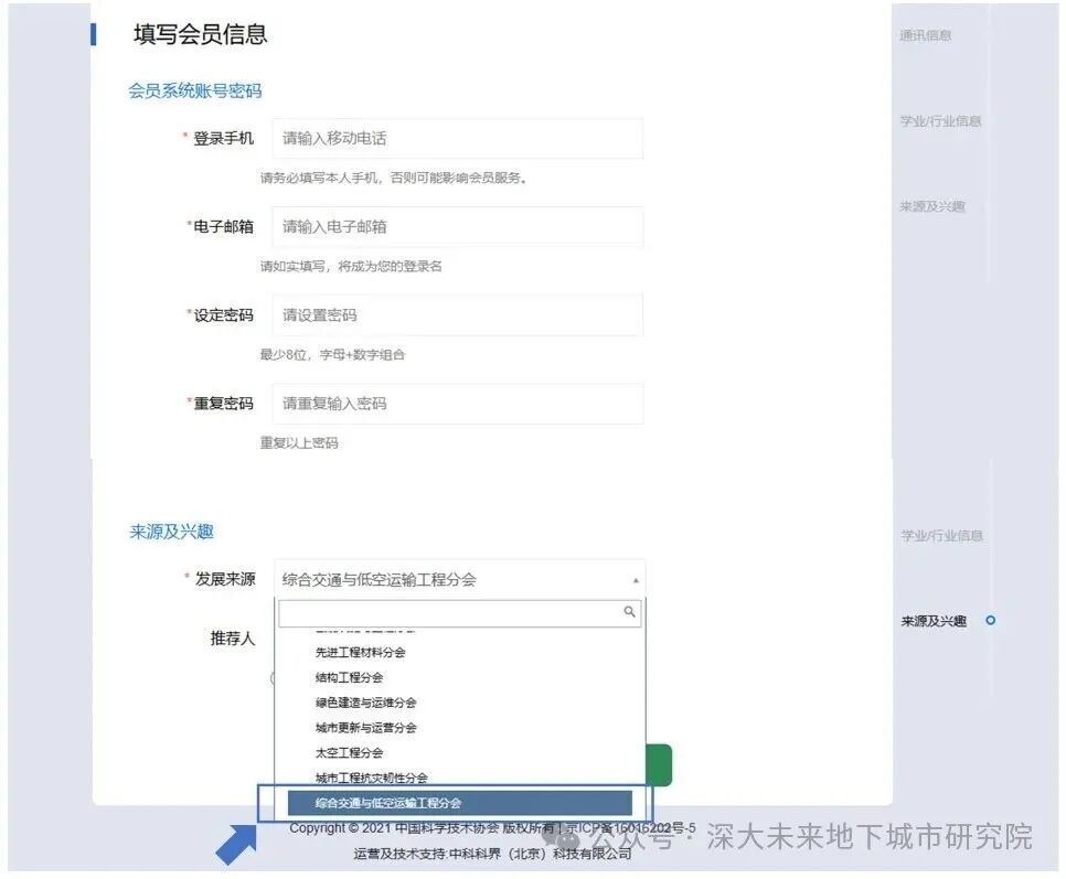4. Complete the organisational/individual membership details. Fields marked with a red asterisk (*) are mandatory and must be accurately filled in. For the source of referral, please select "Comprehensive Transport and Low-Altitude Transport Engineering Branch".
