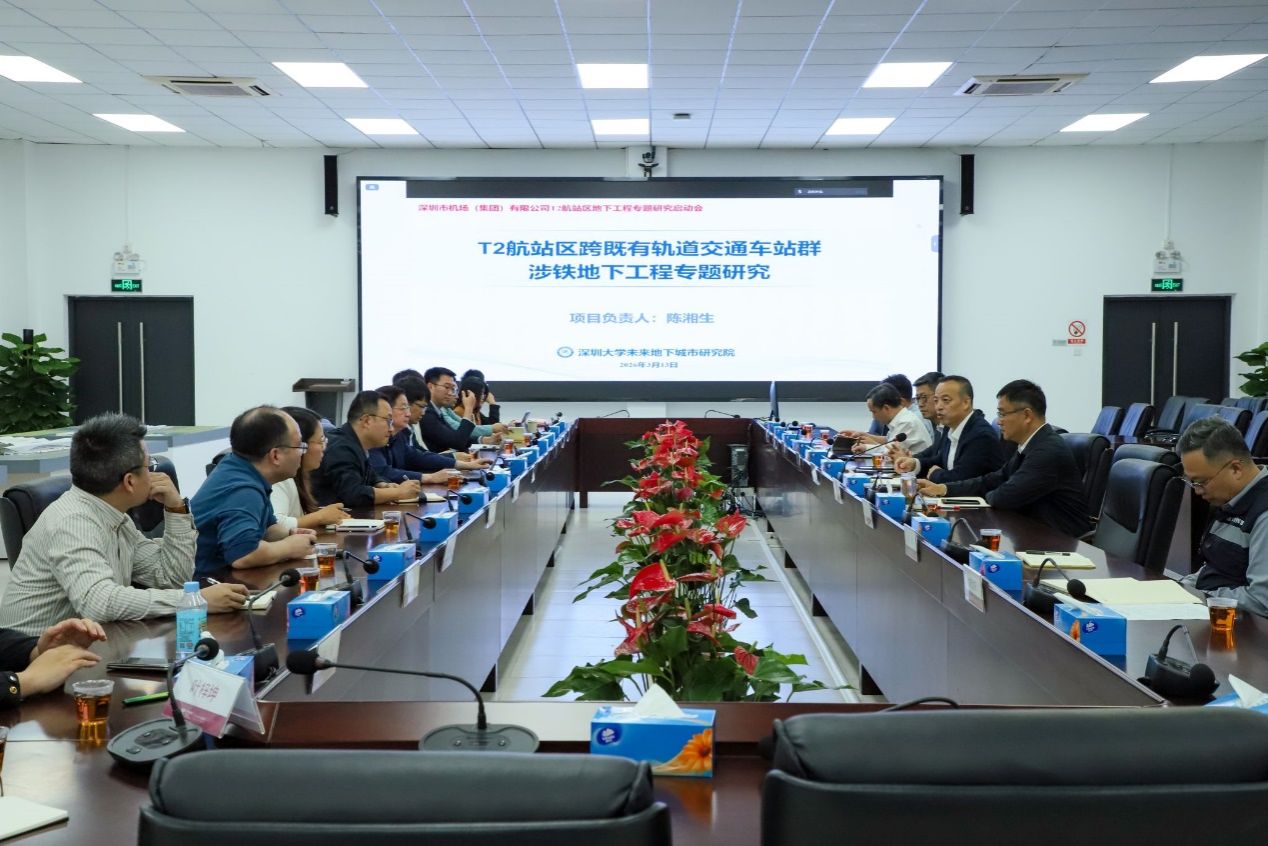 On March 13, 2026, Academician Chen Xiangsheng, President of our institute, led a team to the Shenzhen Bao’an International Airport Construction Project Command Headquarters to hold the kick-off meeting for the project titled “Specialized Study on Underground Engineering Involving Railways in the T2 Terminal Area Crossing Existing Rail Transit Stations.” The meeting was chaired by Yang Haibin, Deputy General Manager of Shenzhen Airport Group and Commander of the Airport Construction Project Command Headquarters. Attendees included Zhu Fanghai, Executive Deputy Commander; Hao Hangcheng, Deputy Commander; Liu Mingqiu, Deputy Chief Engineer; Chen Ke, Quality Director; Chen Gang, Director of the Design and Technology Department; Ban Xiaolin, Deputy Director of the Design and Technology Department; Yao Yuandong, Deputy Director of the Construction Project Command Headquarters; Wang Xuetao, Deputy Director of the Construction Project Command Headquarters; and relevant staff members. Professor Su Dong, Deputy Dean of the Future Underground City Research Institute at the School of Civil and Transportation Engineering; Senior Lecturer Li Dong; Professor Lü Haimin; Professor Xu Tao; Director Chen Xi; and relevant faculty members also attended the meeting.