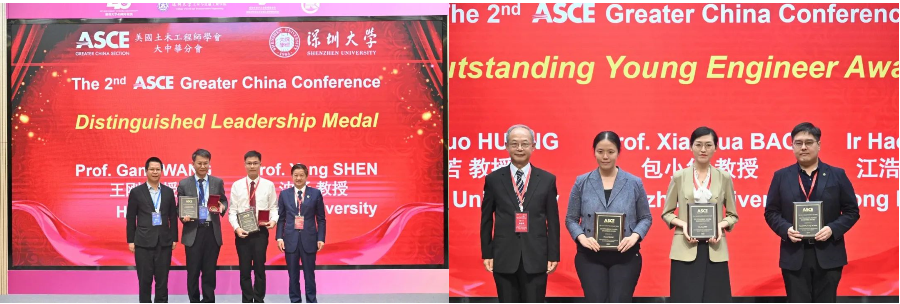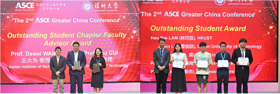 ASCE Greater China awards were also presented, including the Lifetime Achievement Medal to Academician Yongbin Yang, the Distinguished Leadership Medal to Professors Gang Wang and Yang Shen, the Outstanding Young Engineer Award to Professors Duruo Huang, Xiaohua Bao and Jiang Hao, and the Outstanding Instructor Award to Professors Dawei Wang and Yao Cui. Outstanding Young Engineer Award, Outstanding Student Chapter Faculty Advisor Award to Professors Wang Dawei and Cui Yao, and Outstanding Student Award to Professors Lin Qiaoyi, Lei Jiaxin, Lu Lin, Chen Peiyao and Wan Pengjie. Outstanding Student Award.)
