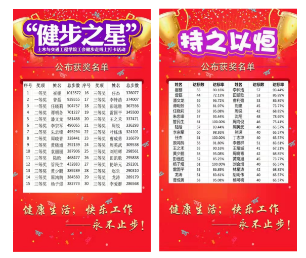 为激励学院内更多的教职工参与本次活动,我院工会共设“健步之星”和“持之以恒”两种奖项并准备了“清空购物车600元”、“清空购物车300元”、苹果蓝牙耳机、筋膜枪等丰厚的奖品,获奖名单如图所示。