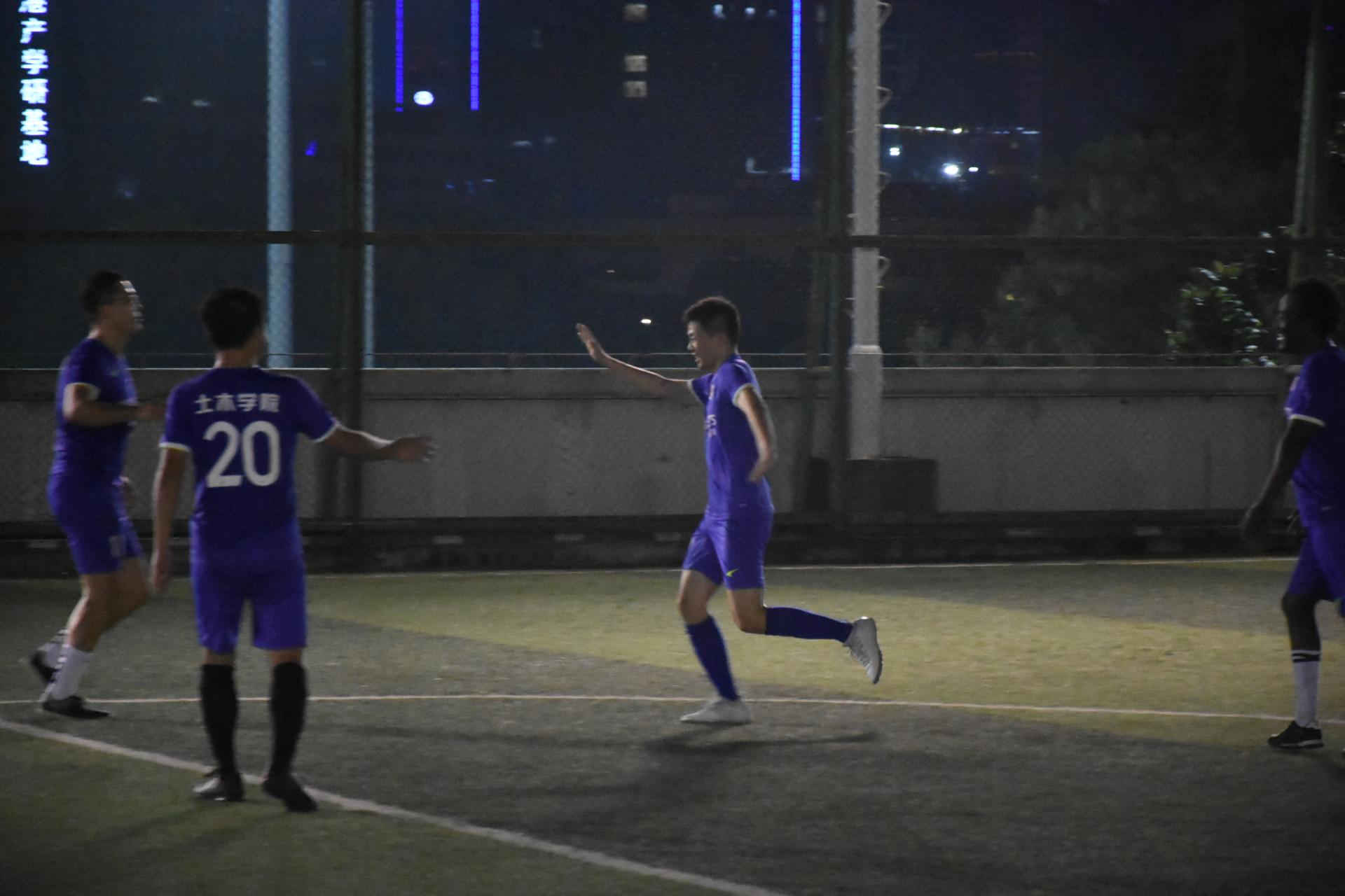下半场比赛开始,面对上半场比赛的不利局面,土木院没有受到影响,而是快速的进入了比赛状态。比赛刚开始,土木院队便展开了强烈而有效的进攻,土木队员们快速带球过人,连续突破传播院队的防守。终于,8号球员陈轮老师接住队友传球,小角度直射传播院队球门,比分扳回1:1。土木队士气大增,对传播院队展开更为猛烈的攻势。在短短一分钟内,土木31号球员Eskinder D.老师再次破门,比分实现反超,到达2:1。传播学院不甘示弱,调整状态,在中场打出了较快的进攻节奏,10分钟后传播学院破门,比分来到2:2。但是土木学院老师们并未气馁,18号球员费建波老师接边线发球,带球过掉几名对方防守球员,远射破门进球,比分变成3:2。比赛结束前,传播学院获得单刀机会,所幸土木院队的9号守门员吴泽洲老师成功扑球化解了此次进攻。接下来的比赛战况激烈胶着,每一位土木球员的眼神是坚定的,都展现出全力防守的决心。最终,在土木院队的积极防守下,传播学院未能进球。比赛以3:2的比分结束。