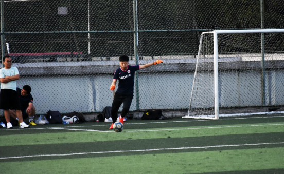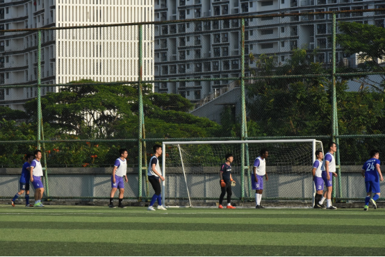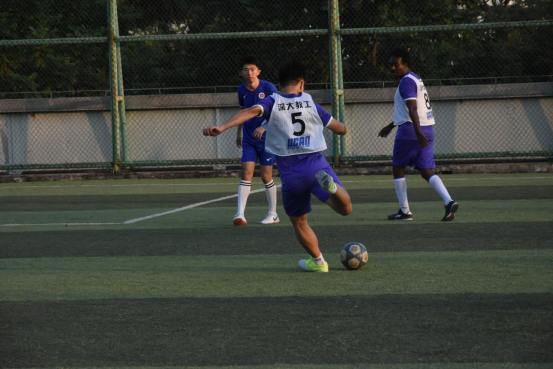 随着总医院队逐渐适应比赛节奏,场上战局陷入焦灼,双方球员均给到对方一波又一波压力。在上半场还剩十分钟时,总医院队申请换人,此后总医院队持续组织高强度进攻,多次在土交院队禁区内进行射门。但土交院队防守密不透风,守门员范成老师注意力集中,每次都能够成功解围。
