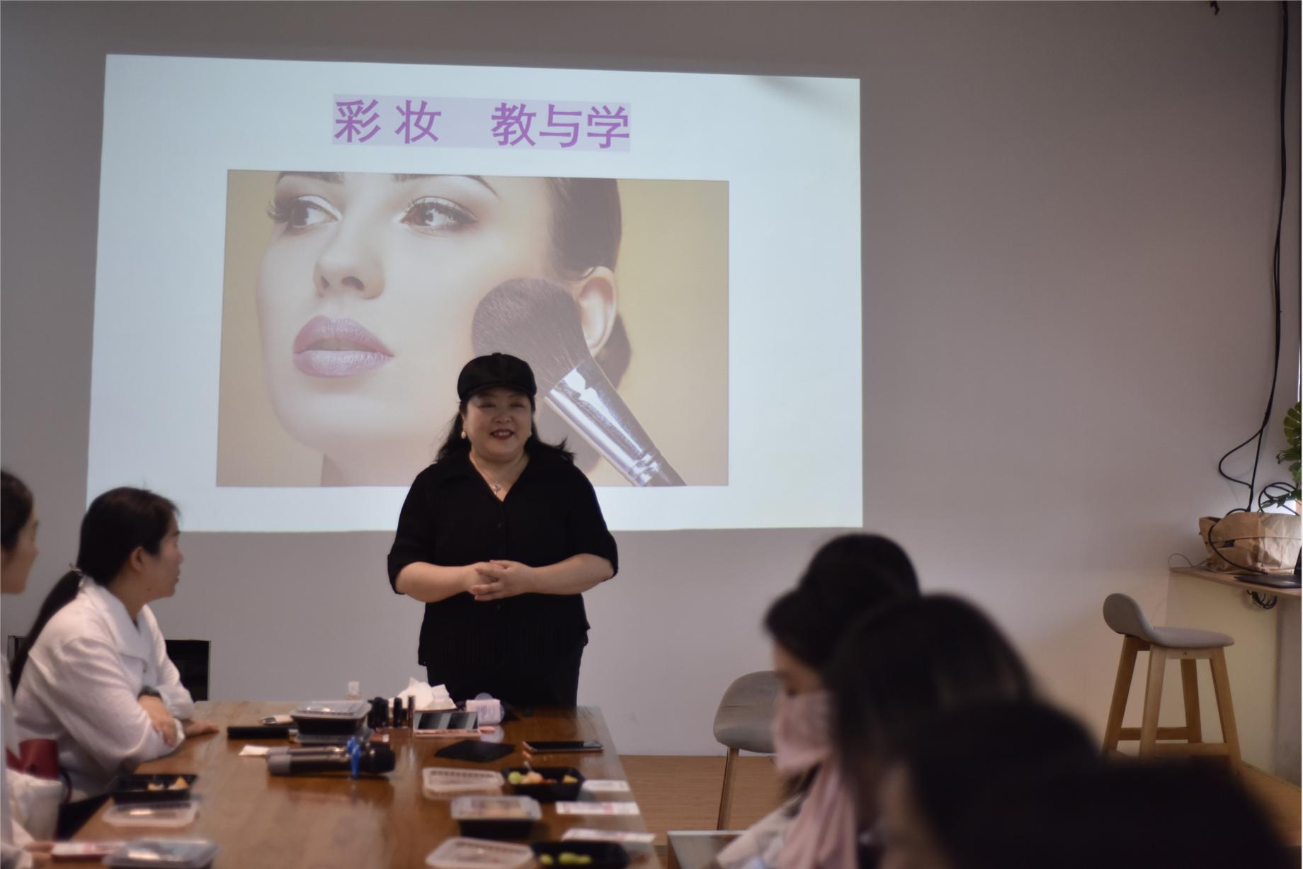 同时,周天莹老师用氧气妆举例,从底妆、眼妆、唇妆、修容四个维度进行美妆讲解,并邀请学院陈碧霞副书记上台进行体验。通过现场实操,让体验者与参与者对化妆手法、不同肤质底妆的选择、彩妆颜色选择、持妆时长等方面的内容有更生动的理解与学习,最终为我们展现了一个根据陈碧霞副书记当日的穿衣风格颜色而化的自然而又精致的妆容。