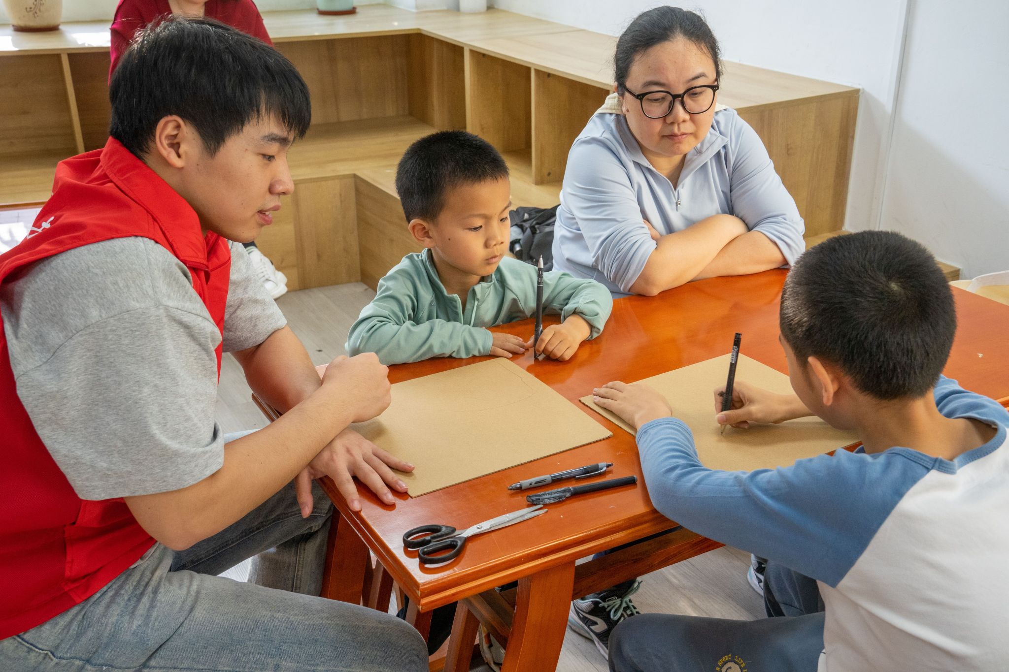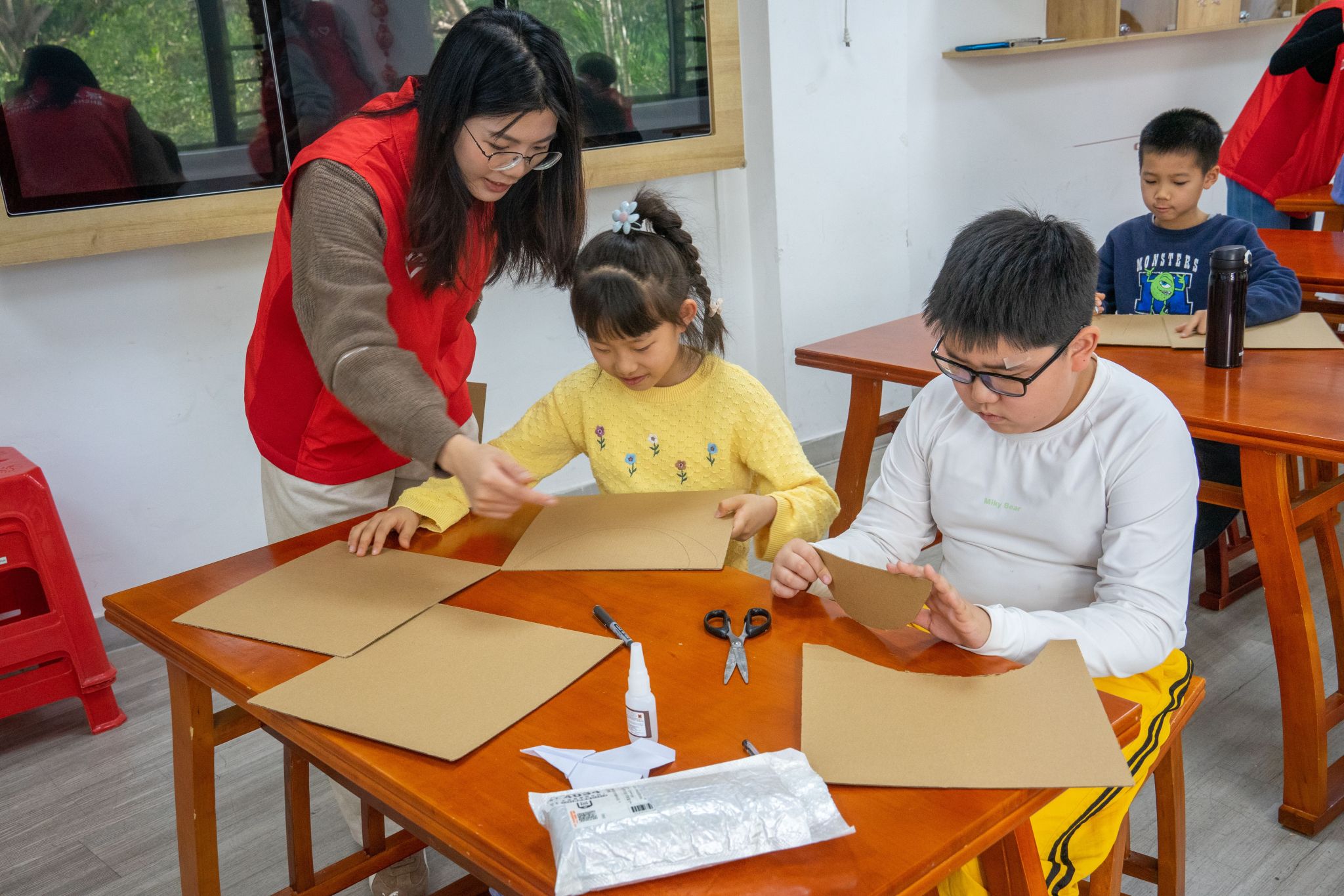 知识讲解环节后,党员志愿者带领小朋友们制作纸板桥梁模型。在顾玉婷的引导和沈庭乐、吕彩茹、陈曦杰、黄媛等同志的悉心协助下,小朋友们分成小组,利用准备好的硬纸板、胶带、剪刀等材料,开动脑筋,亲手搭建属于自己的“桥梁”。志愿者们穿梭于各小组之间,耐心解答疑问,协助解决结构稳固性等“工程难题”,将专业的力学概念以最直观的方式传递给孩子们。活动现场气氛热烈,孩子们兴致盎然,在“建造”过程中不仅锻炼了动手能力与团队协作精神,更对桥梁的结构和承重原理有了切身体会。李嘉豪同志则负责全程摄影记录,捕捉了无数专注制作与成功展示的精彩瞬间。