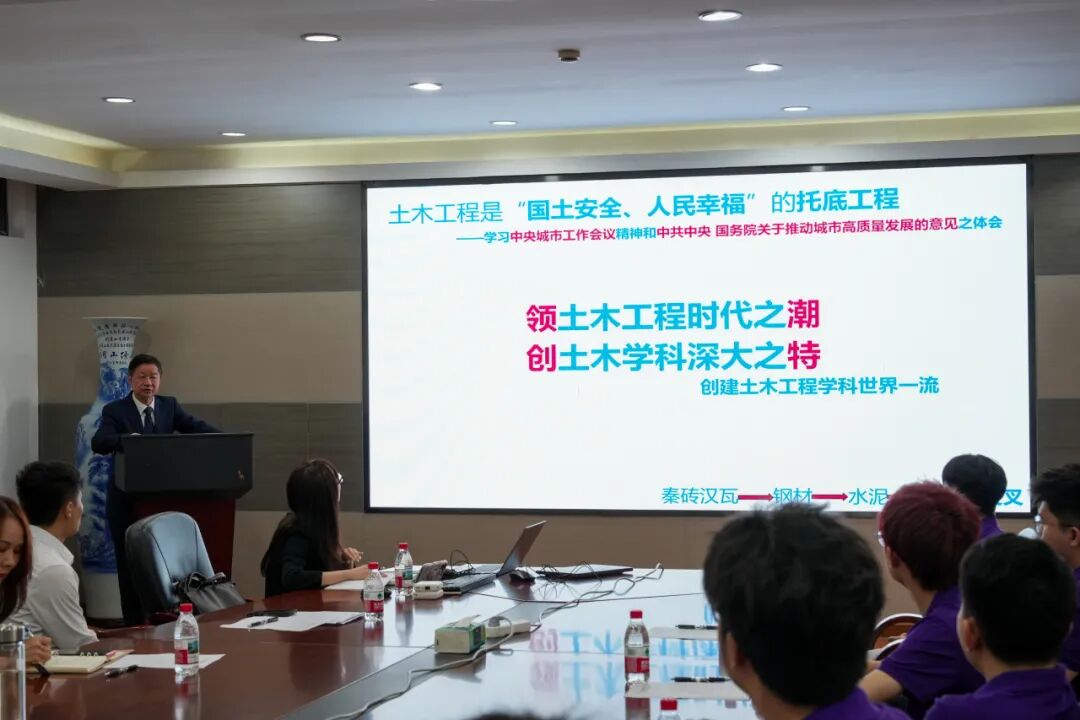 陈院士进一步解读国家城市规划与建设发展战略,阐明了未来行业在基础设施建设、绿色低碳发展、城市安全韧性等领域的发展方向与时代要求,引导同学们跳出课堂看专业,拓宽了学科视野与格局站位。他围绕学院“培养未来土木+智慧复合型人才”的育人理念,系统阐释了如何打造兼具科学精神、人文情怀、哲学思维与国际视野的新时代土木人,并提出构建“工程哲学”虚实融合情景式教学范式、打造数字化教学知识图谱的改革思路,鼓励同学们既要学好专业知识,也要涵养家国情怀与哲学思辨能力。