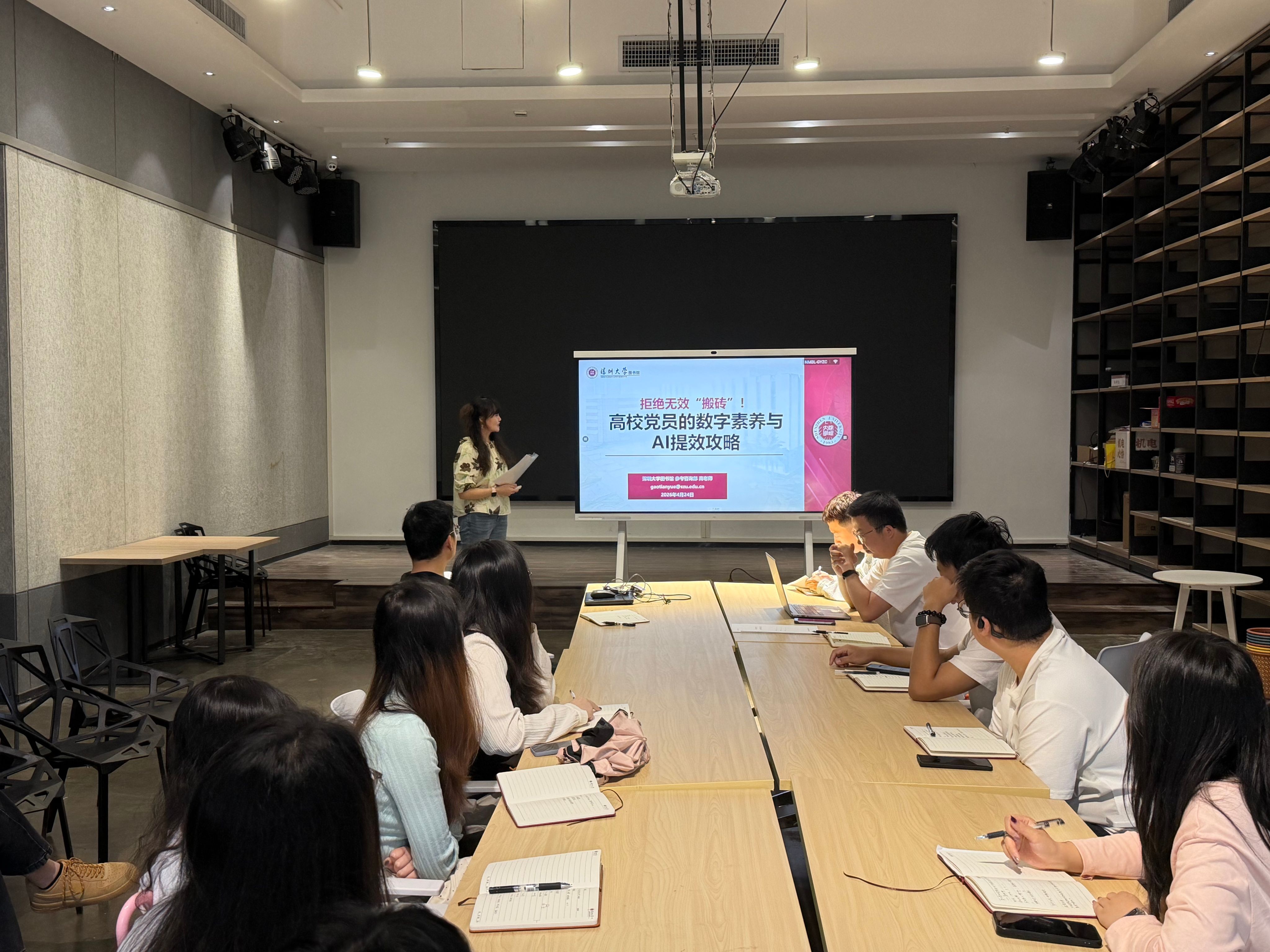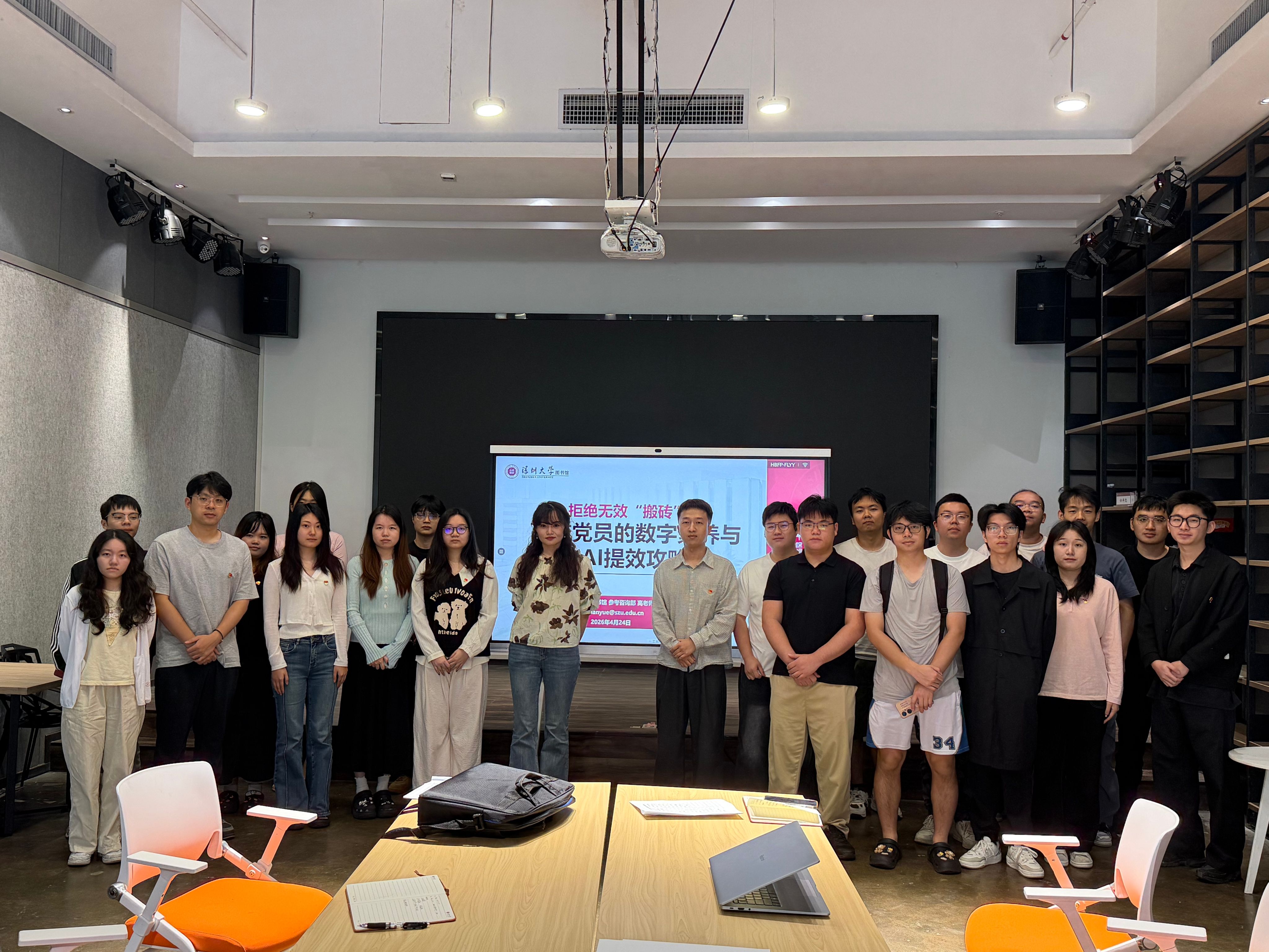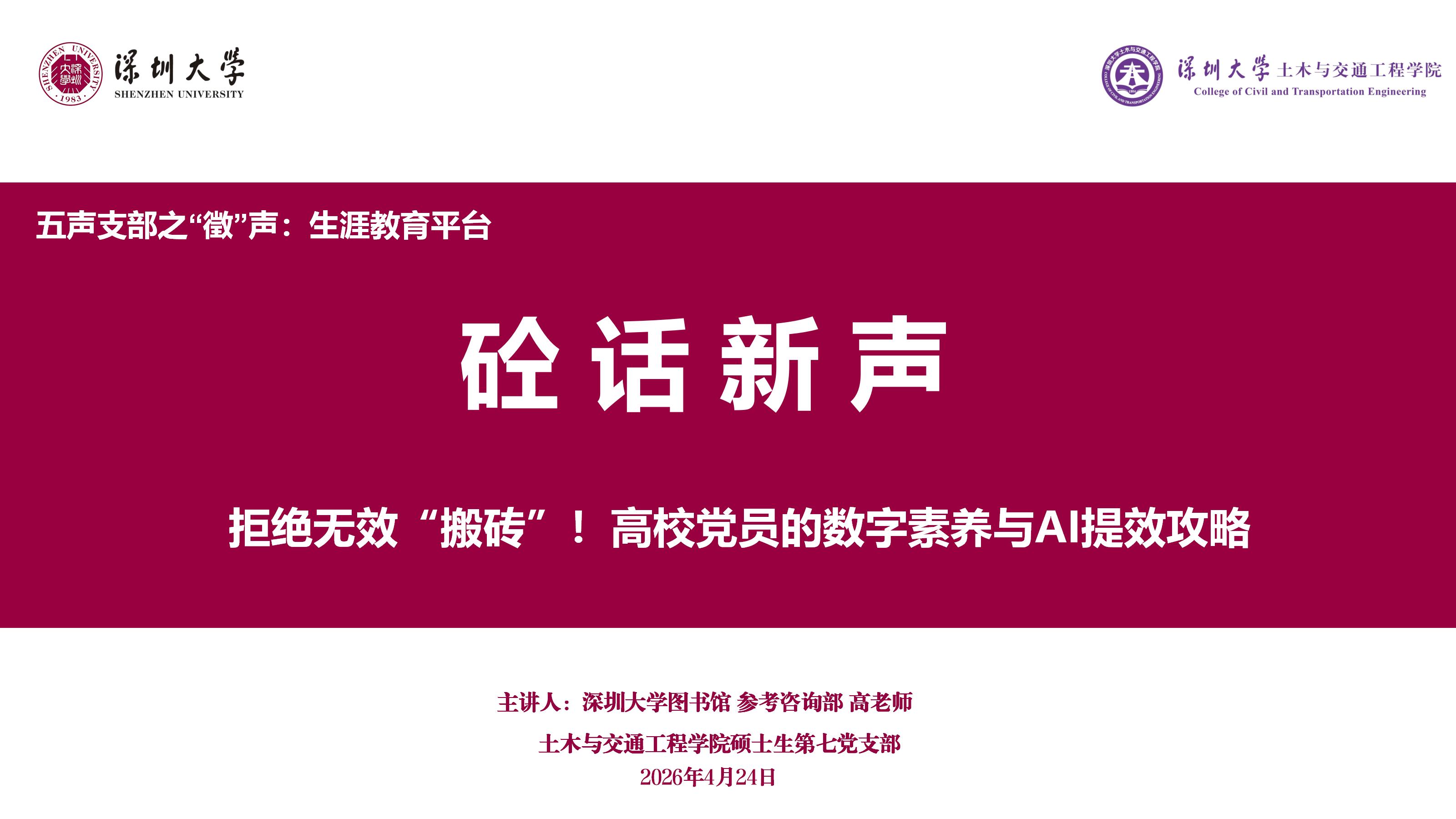 为深入学习贯彻习近平总书记关于数字中国建设的重要指示精神,深圳大学土木与交通工程学院硕士生第七党支部依托“五声”支部特色中徵声——徵声激发、成长赋能生涯教育平台,着眼提升党员与学生数字素养、赋能基层党建数智化转型,4月24日特邀深圳大学图书馆高天玥老师在沧海学生社区友邻共享空间开展《拒绝无效“搬砖”!高校党员的数字素养与AI提效攻略》专题讲座,支部党员及部分发展对象共27人参加。