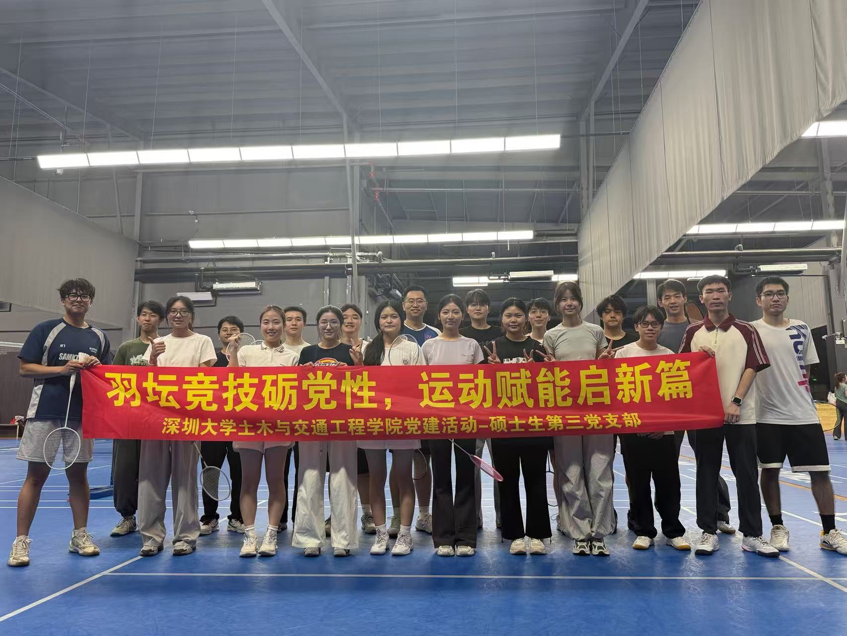 为深入学习贯彻习近平新时代中国特色社会主义思想,丰富组织生活形式,强化党员宗旨意识与团队协作精神,2026年4月24日下午,深圳大学土木与交通工程学院硕士生第三党支部组织支部党员共22人,赴室内羽毛球馆开展"羽坛竞技砺党性,运动赋能启新篇"主题党日活动。